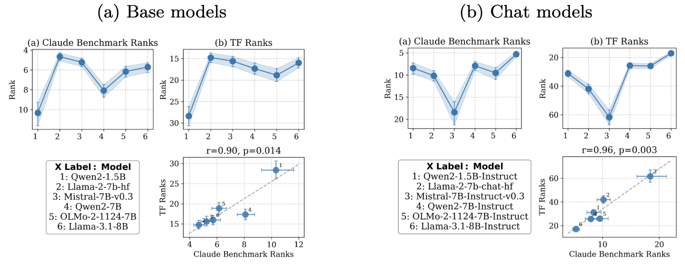 Two things stand out here. First, the pipeline ranks correlate strongly with the reference benchmark we generated with Claude for both base and chat models — perplexity holds up for base models but collapses as a signal once you add instruction tuning. Second, base models are almost always better their chat-aligned counterparts on domain knowledge: instruction tuning trades away factual domain knowledge for conversational compliance. This “alignment tax” is real, measurable, and heterogeneous — Llama-2-7B and Mistral-7B show severe drops while Qwen2-1.5B and Llama-3.1-8B are much more robust.
