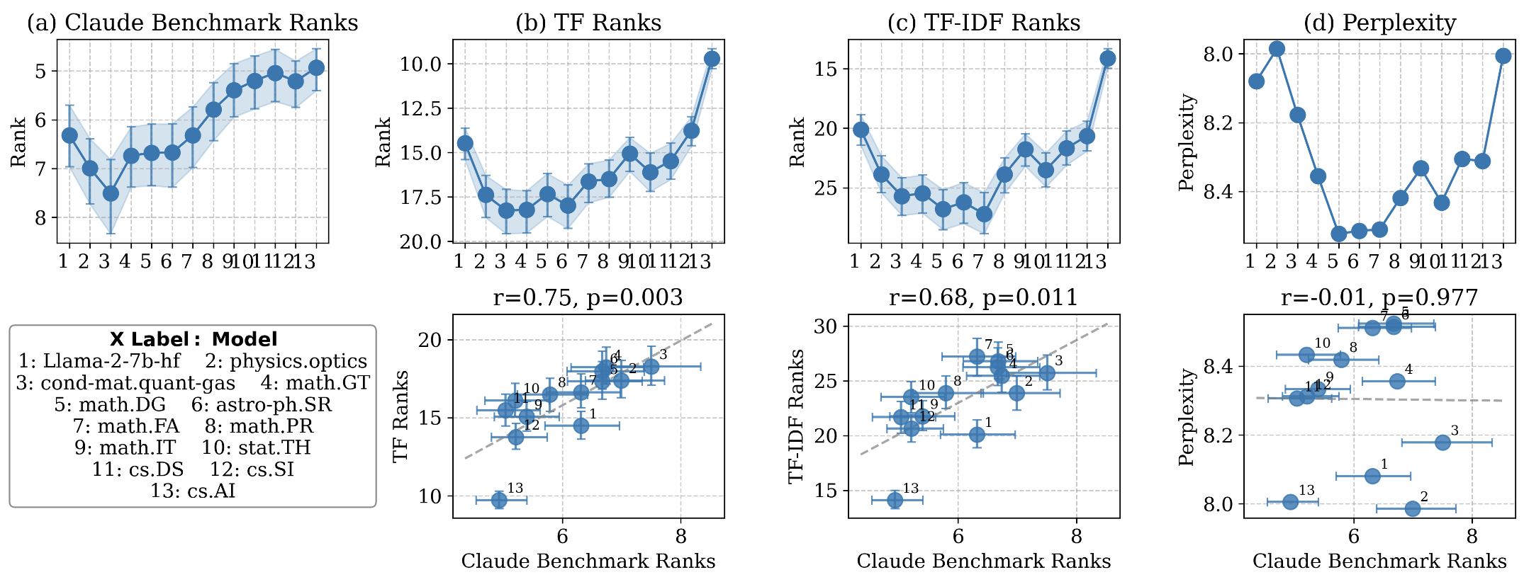 The rank-based metrics tell a coherent story: domain knowledge of CS.AI initially drops as the model trains on unrelated domains, stabilizes in the middle, then improves as training domains converge toward CS.AI. Perplexity shows no such pattern — it oscillates without correlation to what the model actually knows. This is the clearest demonstration I have of why perplexity is the wrong tool for tracking continual learning progress.