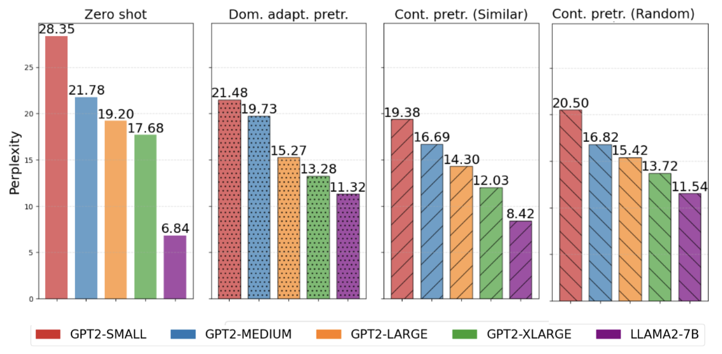 There is an important caveat for large models. Llama-2-7B did not benefit from continual pretraining in our setup. The reason is not architectural — it is a data quantity issue. The individual domain corpora we used (circa. 7B tokens from the M2D2 dataset) are too small to meaningfully shift a 7B parameter model in a single epoch. If your target domain corpus is large enough and your model is large, standalone DAPT may be sufficient. The threshold scales with model size.