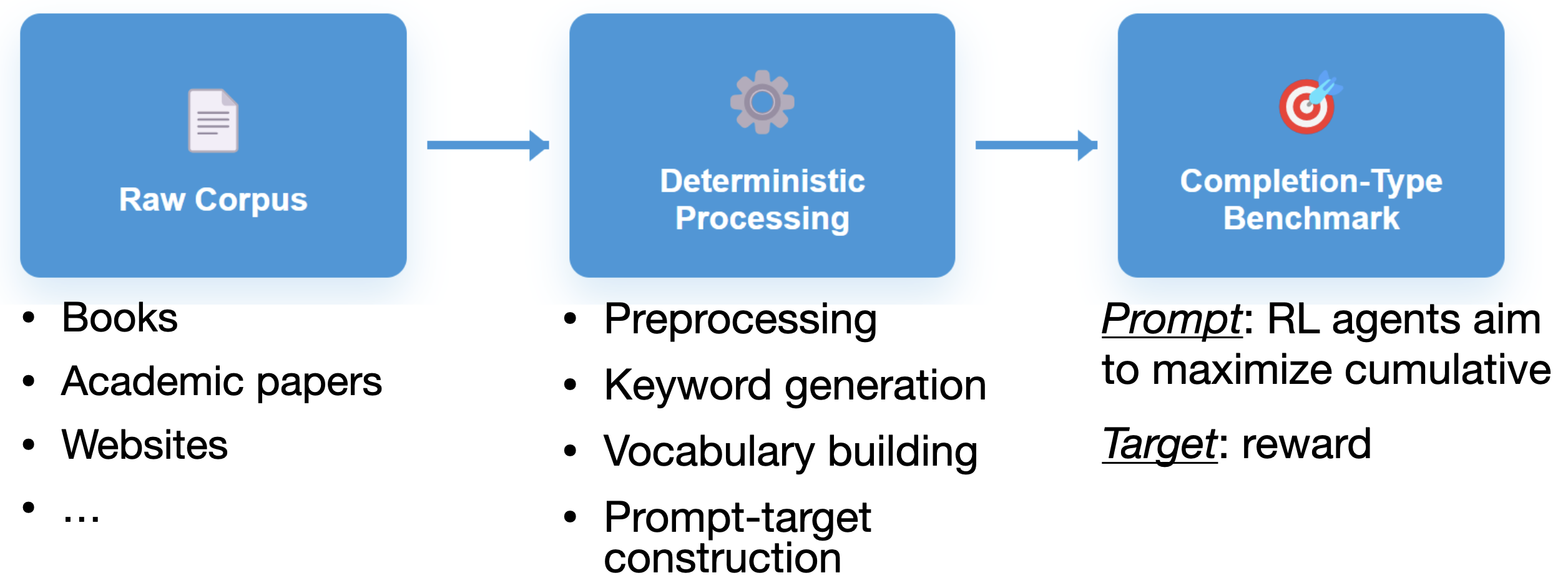 The pipeline to construct domain-specific prompt-target pairs is fully automated: given any raw text corpus, it extracts domain keywords using n-gram statistics and embedding-based deduplication, matches sentences to keywords, and constructs prompt–target pairs where the target is a domain-specific term. For example, for the keyword reinforcement learning, a target might be replay given the prompt “Prior attempts at improving data efficiency in reinforcement learning involved the use of an Experience”. No human annotation, no LLM calls, no contamination risk. Conveniently, the benchmark can be regenerated from fresh data at any time.