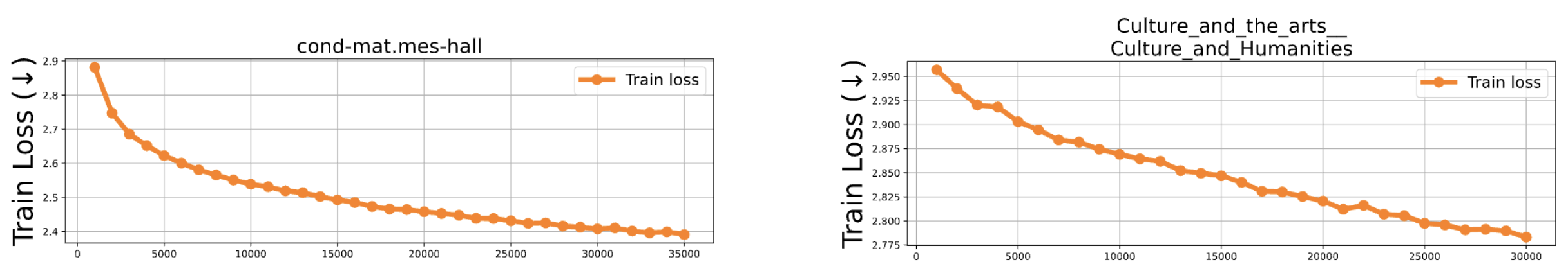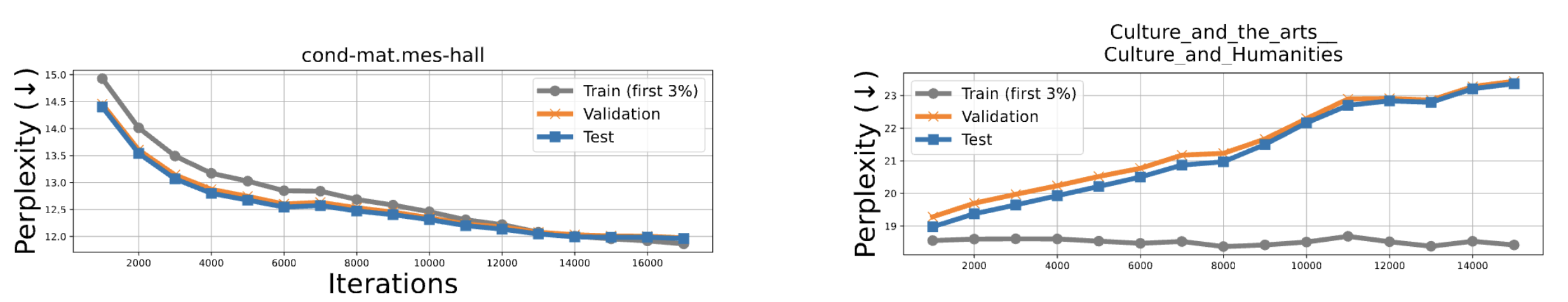 Let’s start with a concrete experiment. Take GPT-2 and continue pretraining it on two groups of domains: Wikipedia articles (History, Culture, Technology, …) and scientific papers from Semantic Scholar (Physics, Mathematics, Astrophysics, …). In both cases, the training loss goes down — the model is learning, nothing looks wrong.