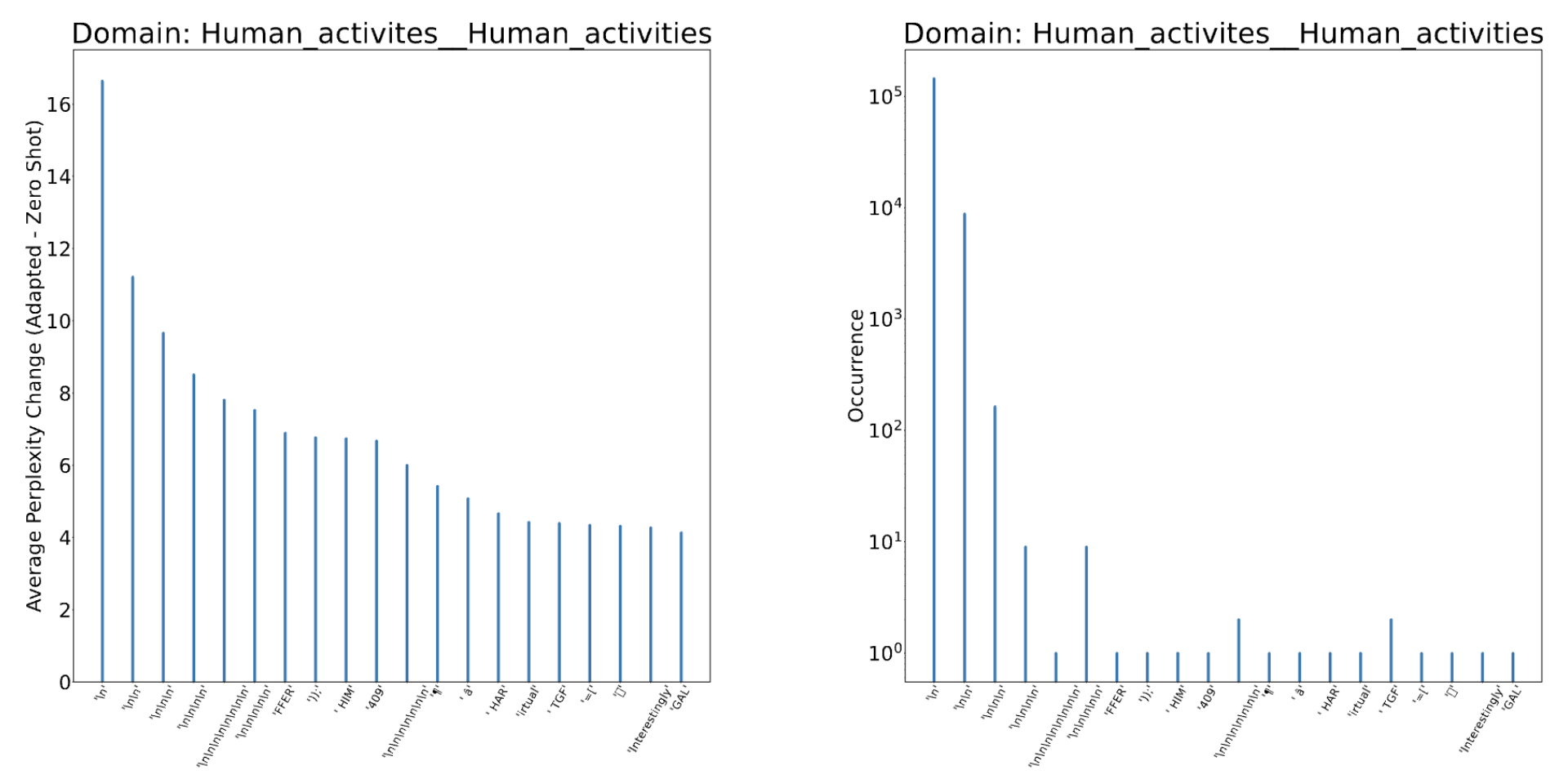 When you break perplexity down to the token level, the degradation on Wikipedia domains is not spread evenly across the vocabulary. It is concentrated in a small number of domain-irrelevant tokens — newline characters, punctuation, generic function words. These tokens appear frequently in any text, so they dominate the aggregate perplexity. A model could be learning your domain vocabulary perfectly and still show degraded perplexity if its predictions for \n and . have shifted slightly.